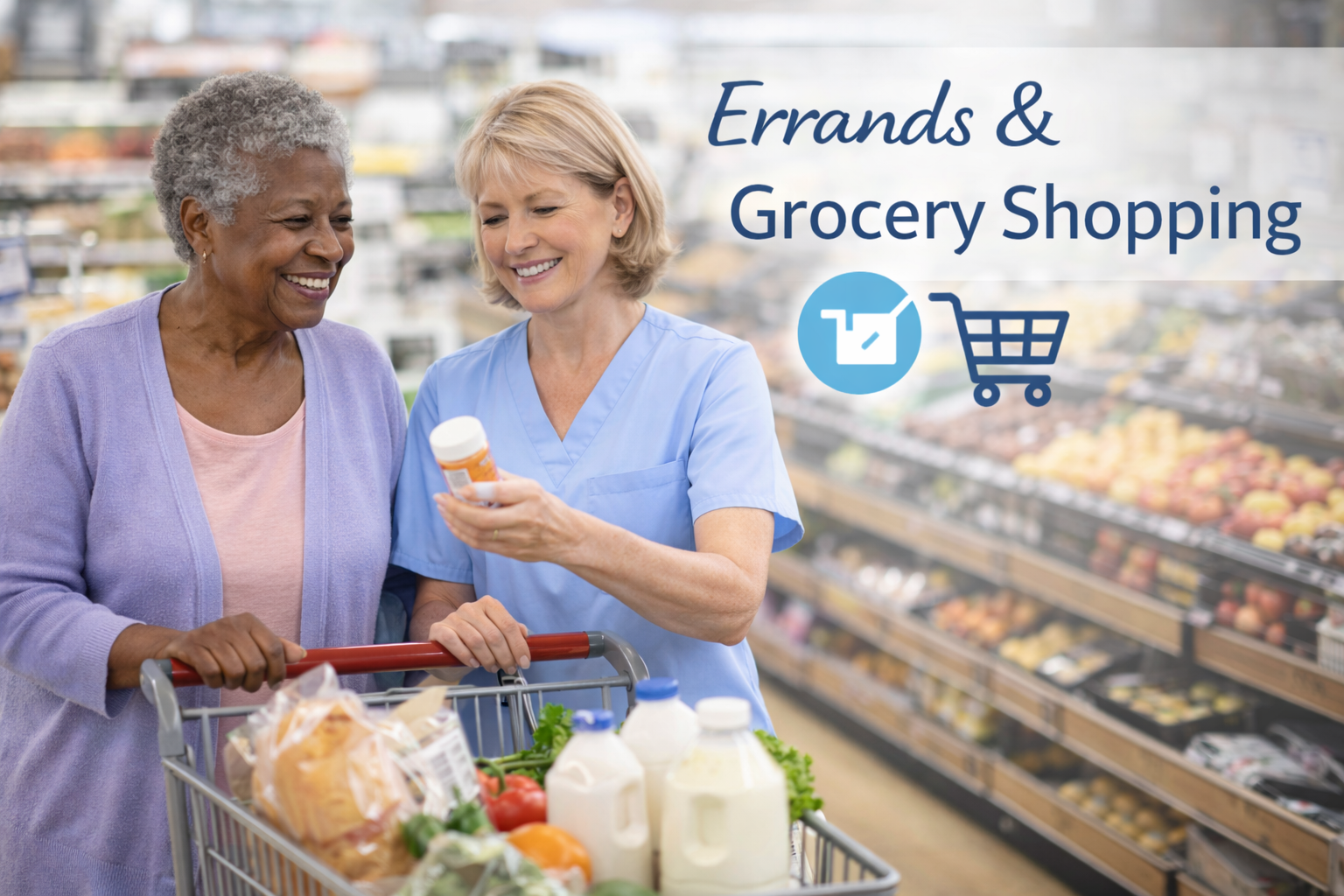 Our non-medical errand and grocery shopping services provide reliable, practical support for adults and seniors who may find it difficult to manage everyday tasks independently. Caregivers assist with grocery shopping, prescription pick-ups, and routine errands such as household supplies or post office visits. This service helps ensure clients have access to nutritious food, essential medications, and daily necessities while reducing safety risks, stress, and physical strain. Families gain peace of mind knowing their loved one has dependable support to stay organized, well-supplied, and engaged in the community.